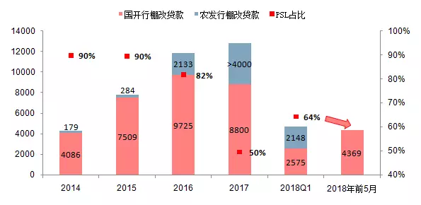 中信建投数据显示,PSL作为棚改金融工具,2014年到2016年占国家开发银行和中国农业发展银行棚改贷款比例分别为90%、90%和82%,2017年开始大幅下降,仅为50%,2018年一季度为64%。