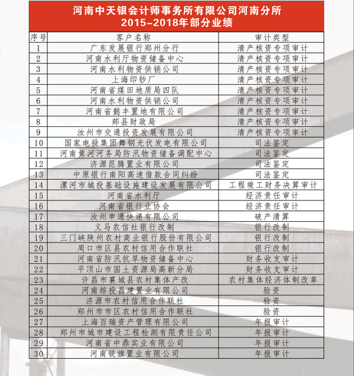 河南中天银会计师事务所部分业绩